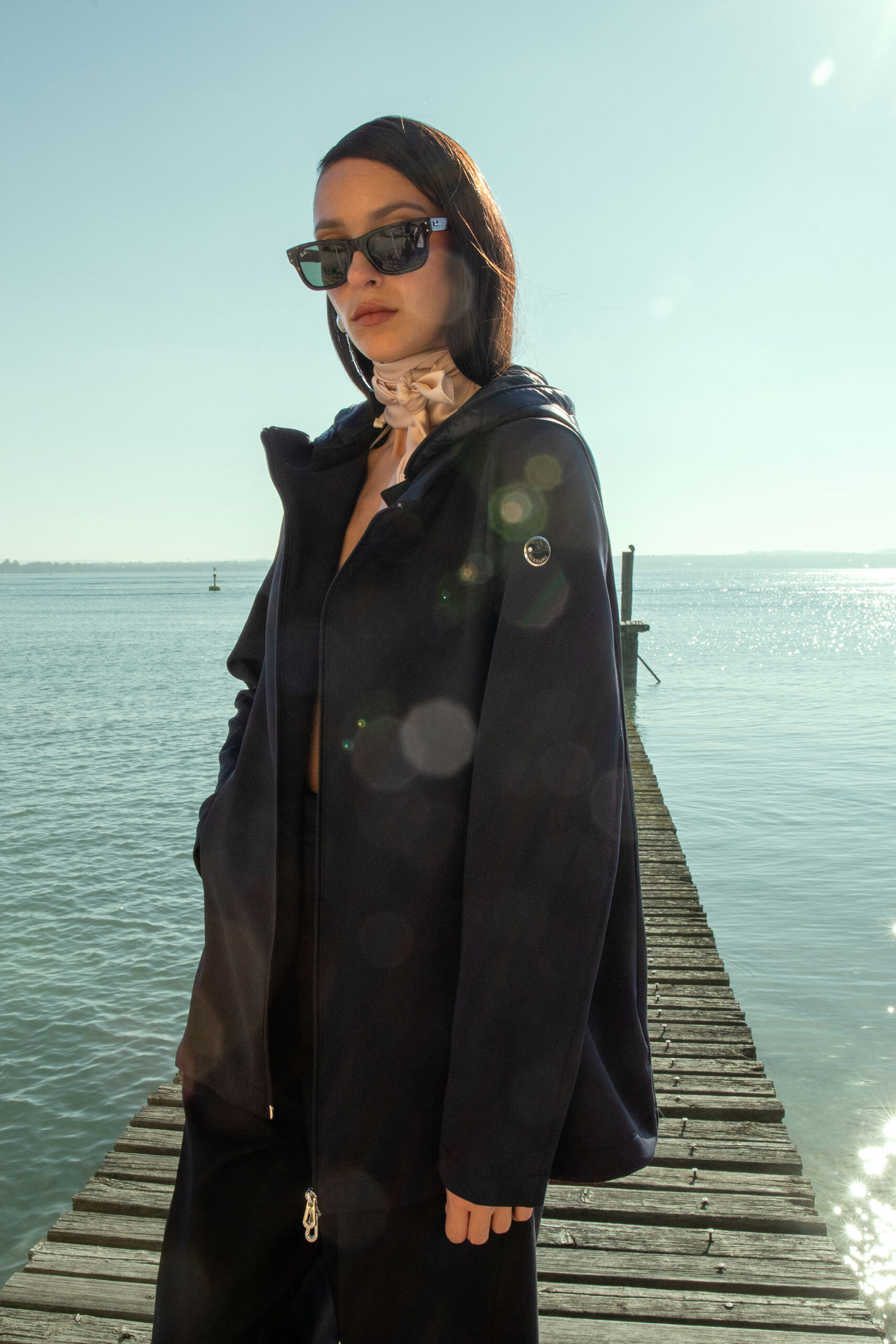 Jacket realizzato in poliestere stretch, internamente foderata. dotata di full zip centrale a doppio cursore tono su tono, ampie tasche laterali con zip e cappuccio fisso, offre praticità e modernità. La silhouette slim, con una linea femminile e raffinata, esalta la vestibilità e la portabilità del capo.