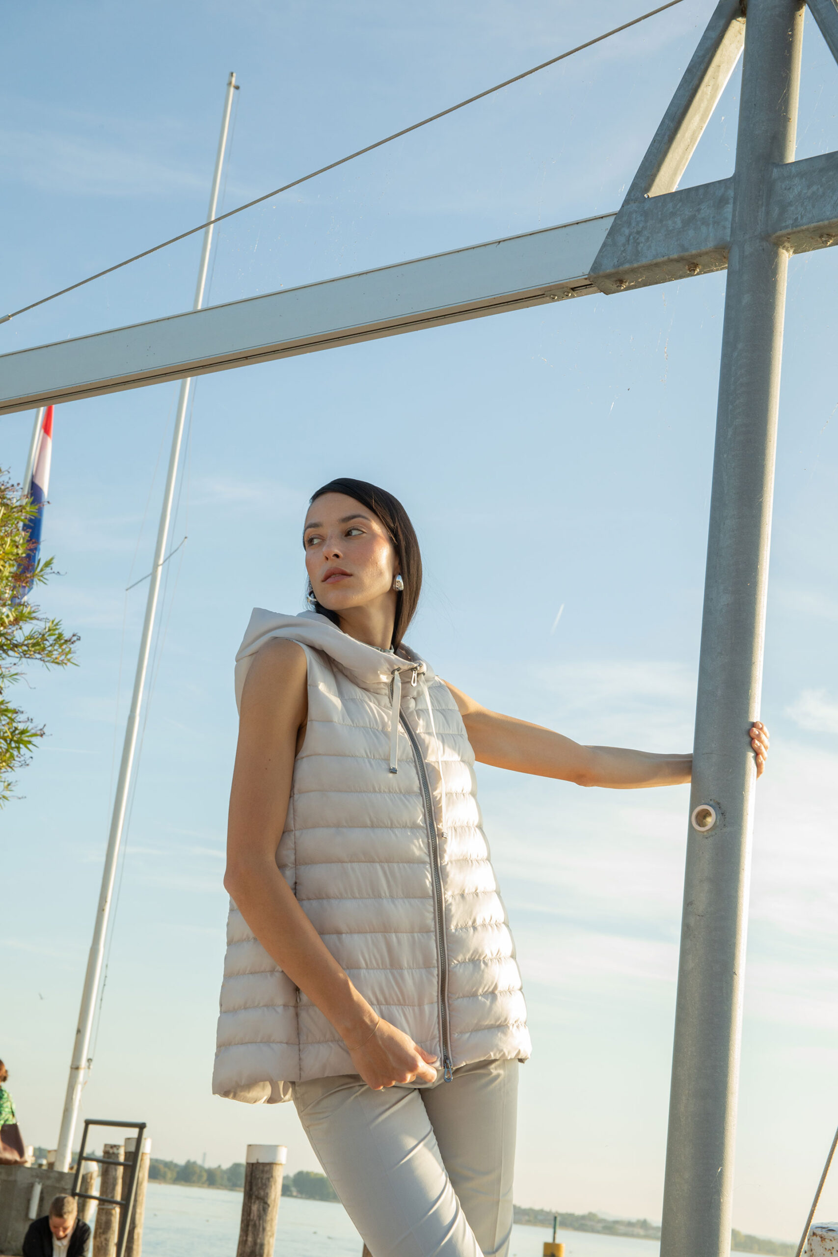 Gilet imbottito in tessuto 100% poliestere, dalla texture liscia e morbida al tatto e un aspetto semi-lucido. chiusura con zip, tasche laterali con zip invisibile. Imbottitura effetto piuma.